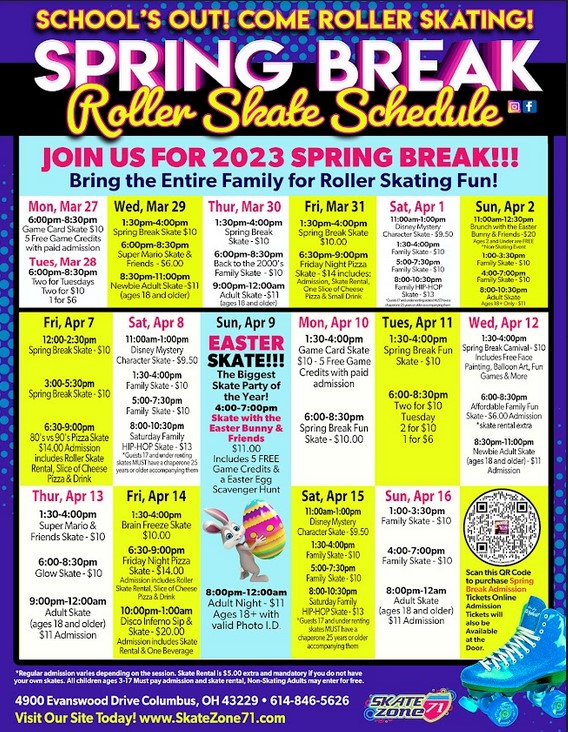 Spring Break Roller Skating is Monday March 27th 2023 through Sunday, April 16th 2023.