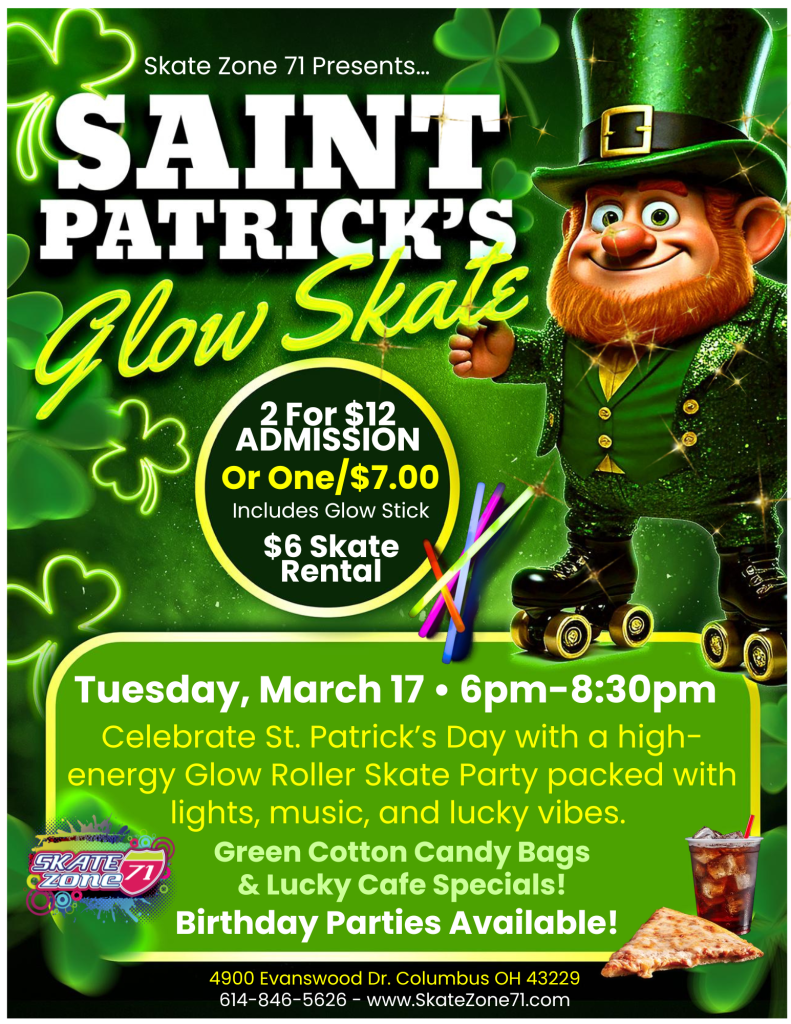 Celebrate St. Patrick’s Day with a high energy glow roller skate session packed with lights, music and lucky vibes! Enjoy Green Cotton Candy Bags and Lucky Cafe Specials!
