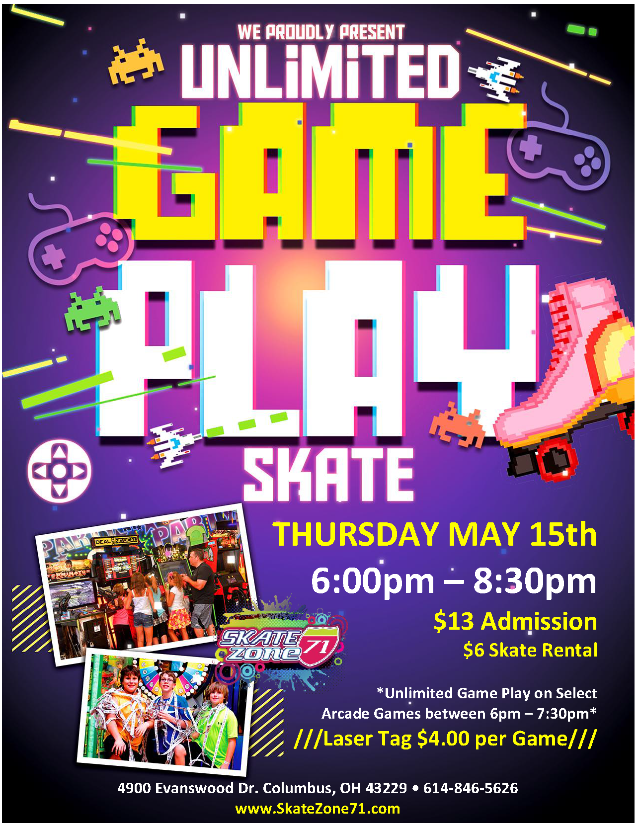 Skate Zone 71 is starting Summer Early with this Unlimited Game Play Skate!! Each admission includes an activated Game Card and from 6:00pm – 7:30pm select arcade games will be unlimited play!