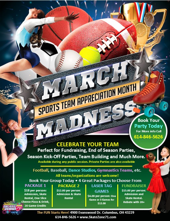 Skate Zone 71 is the perfect place to celebrate your TEAM and during what better time than March Madness! Bring your whole group, team, organization, studio and skate to the […]