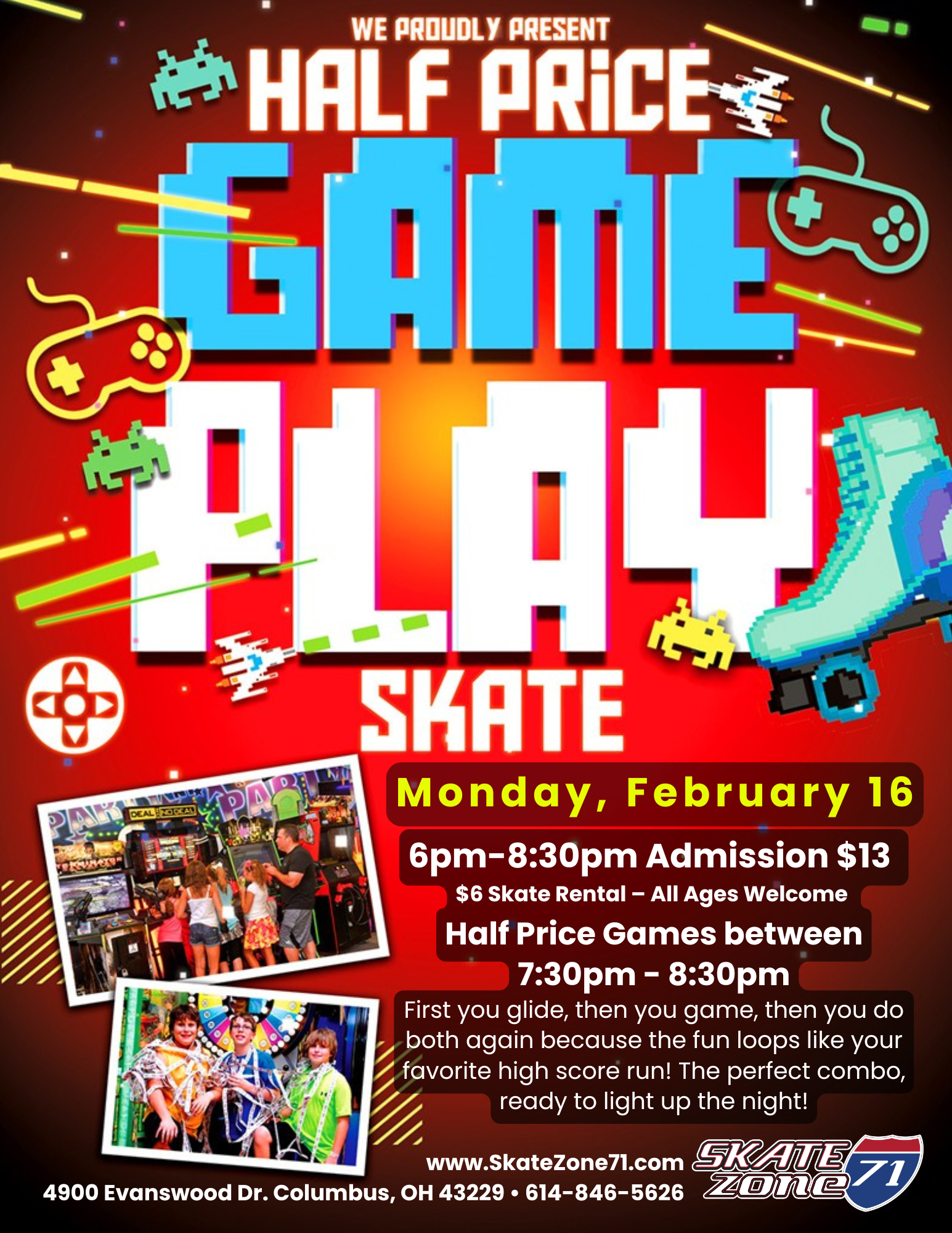Presidents' Day Half Price Game Skate Monday February 16th, 2026 | 6:00 PM – 8:30 PM First you glide, then you game, then you do both again because the fun […]
