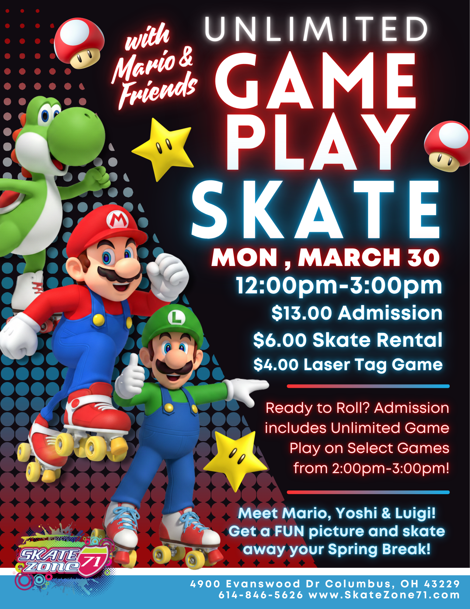 Mario & Friends Unlimited Game Skate Monday, March 30th 6:00 PM - 8:30 PM Unlimited Game Play on Select Arcade Games from 7:00pm - 8:00pm. 🎟️ Admission: $13.00🛼 Skate Rental: $6.00 PURCHASE TICKETS HERE! […]