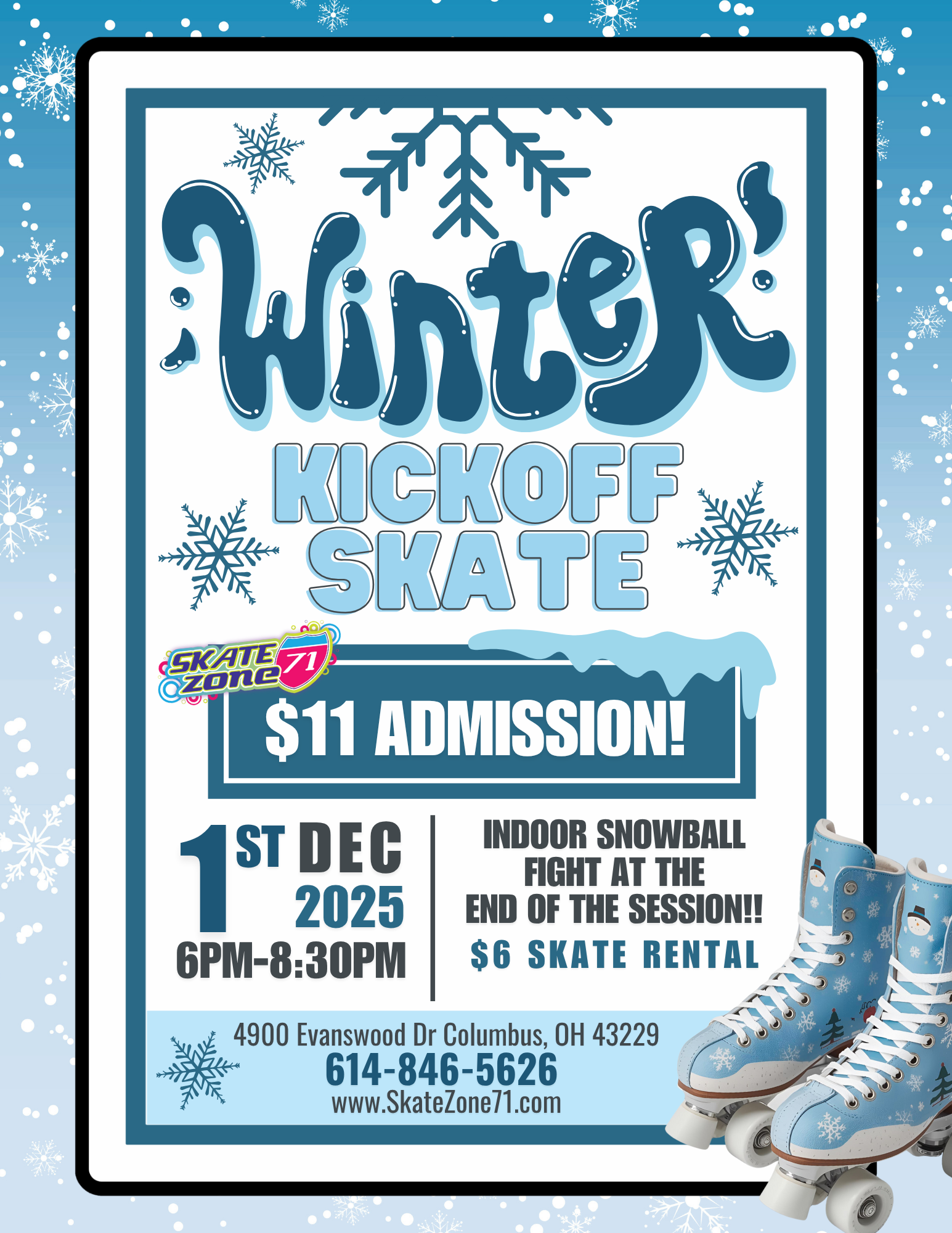 Winter Kickoff Skate Monday December 1st | 6:00 PM – 8:30 PM Roll into winter with music, lights, and nonstop fun. Bring your friends and start the season right on wheels. There will be an indoor snowball fight at the end of the session!! 🎟️ Admission: $11.00 🛼 Skate Rental: $6.00 PURCHASE TICKETS HERE! ⏰ Session Times: Begin and […]
