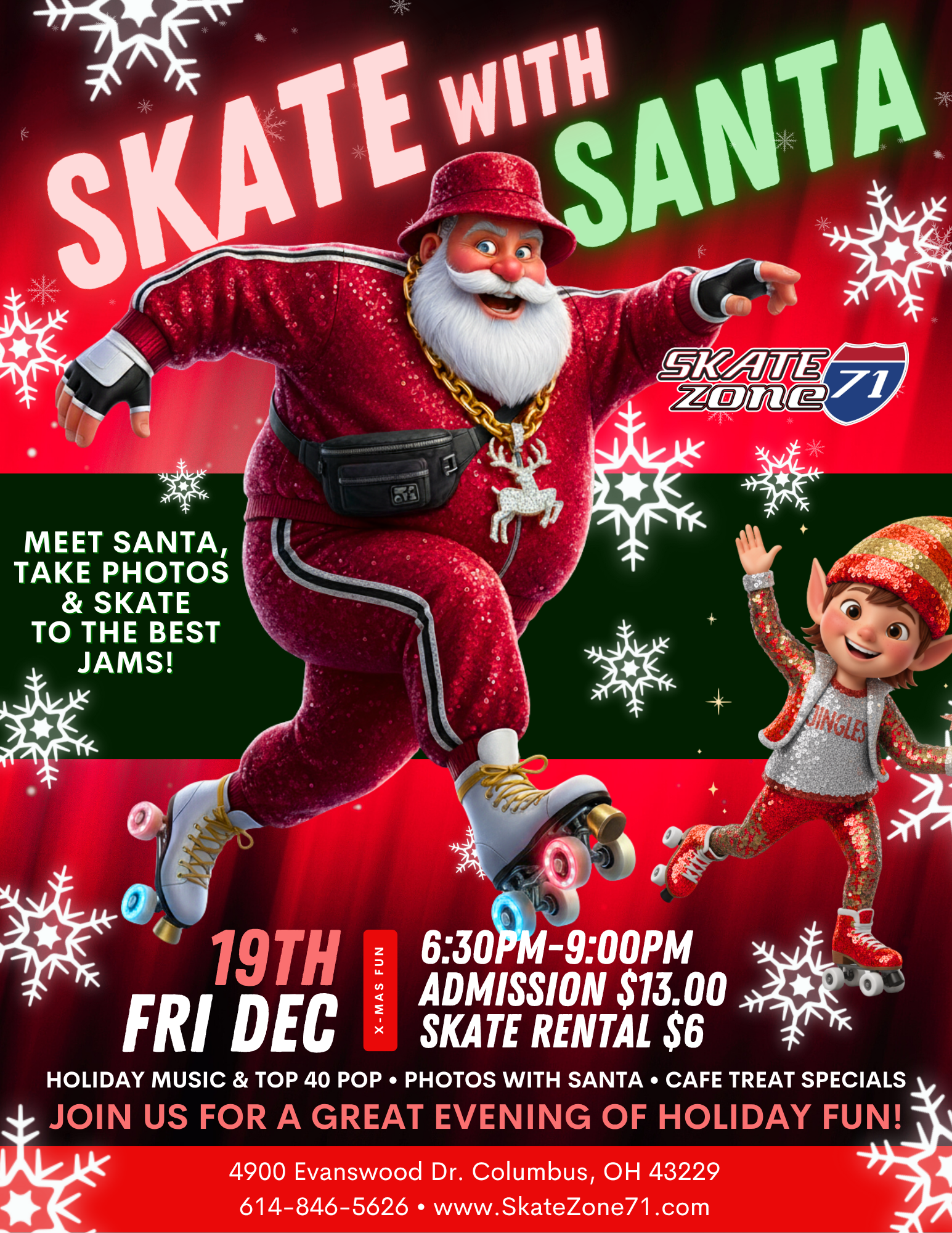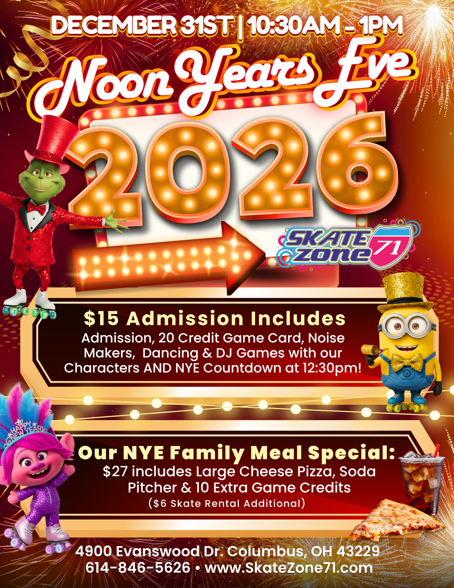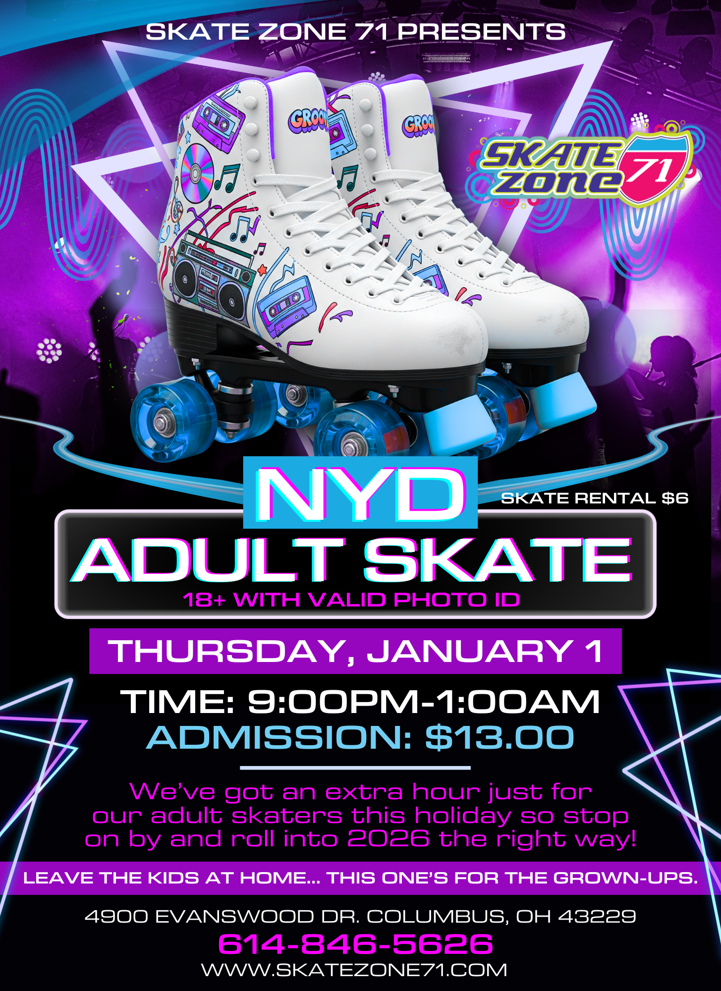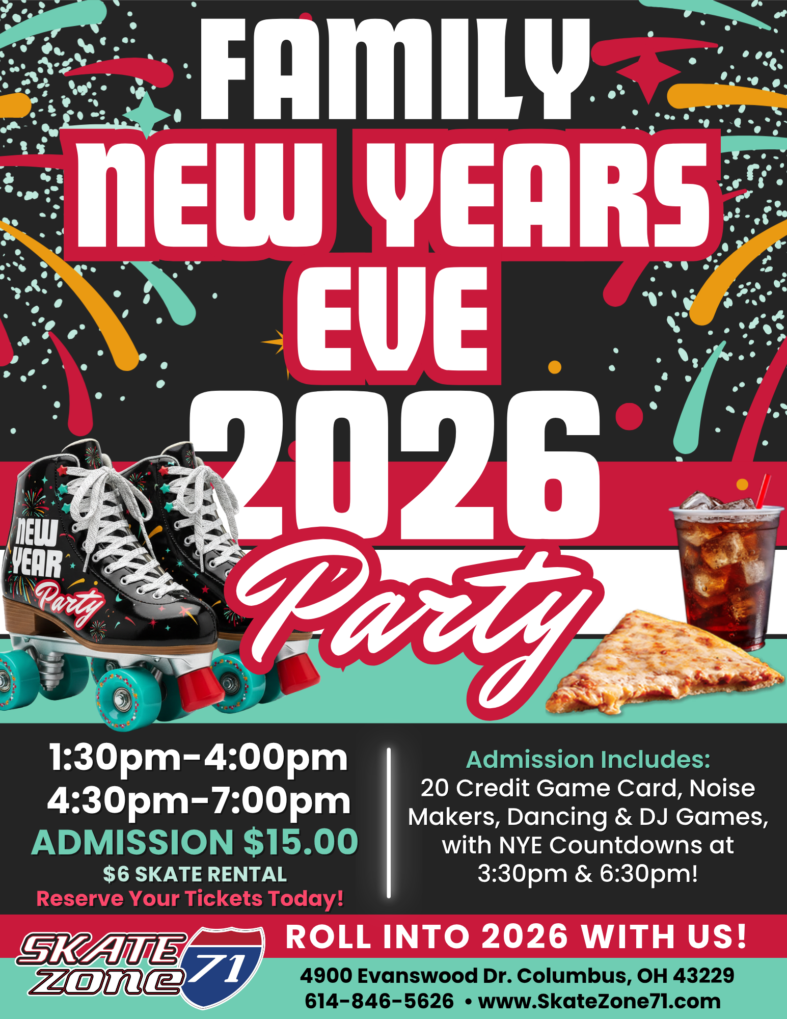 Family New Years Eve Skate Wednesday December 31st | 4:30 PM – 7:00 PM Can't make it 'til Midnight? Skate Zone 71 has you covered, join us for a NYE skate session for the whole family!! Bring your friends & family for an early evening filled with music, lights, and nonstop skating excitement!!! Admission: $15.00 […]