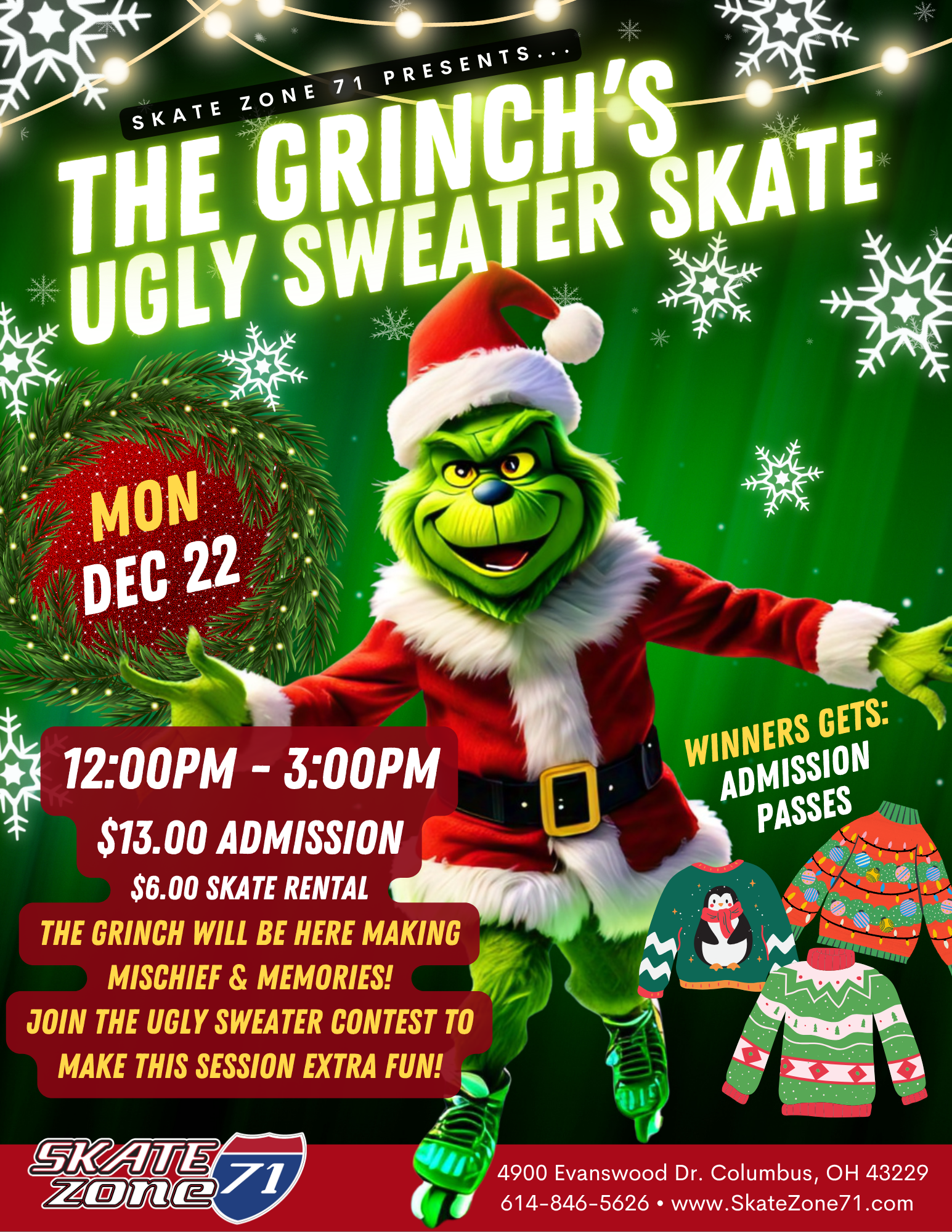 Grinch Ugly Sweater Skate Monday December 22nd | 12:00 PM – 3:00 PM He’s back to steal the spotlight — and maybe your presents! Join us for a session of mischief & memories with a Grinchy fun visit, complete with a holiday Ugly Sweater Contest! Enter the contest and have your chance to win FREE Future […]