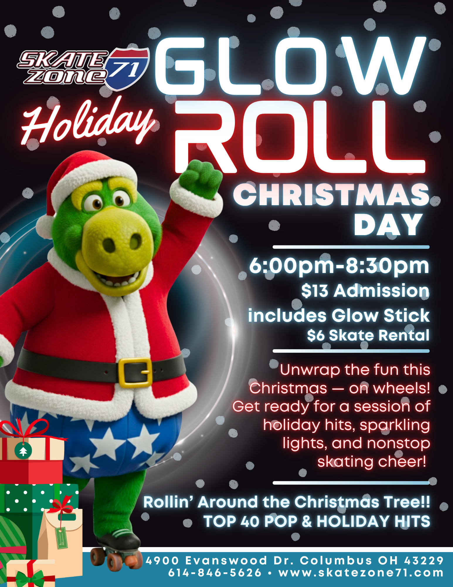 Holiday Glow Roll Skate Thursday December 25th | 6:00 PM – 8:30 PM Keep the holiday fun rolling! After the gifts are opened, come skate the night away under our holiday glow lights! Admission: $13.00 includes Glow StickSkate Rental: $6.00 PURCHASE TICKETS HERE! ⏰ Session Times: Begin and end at the posted start & end time—no stayovers […]