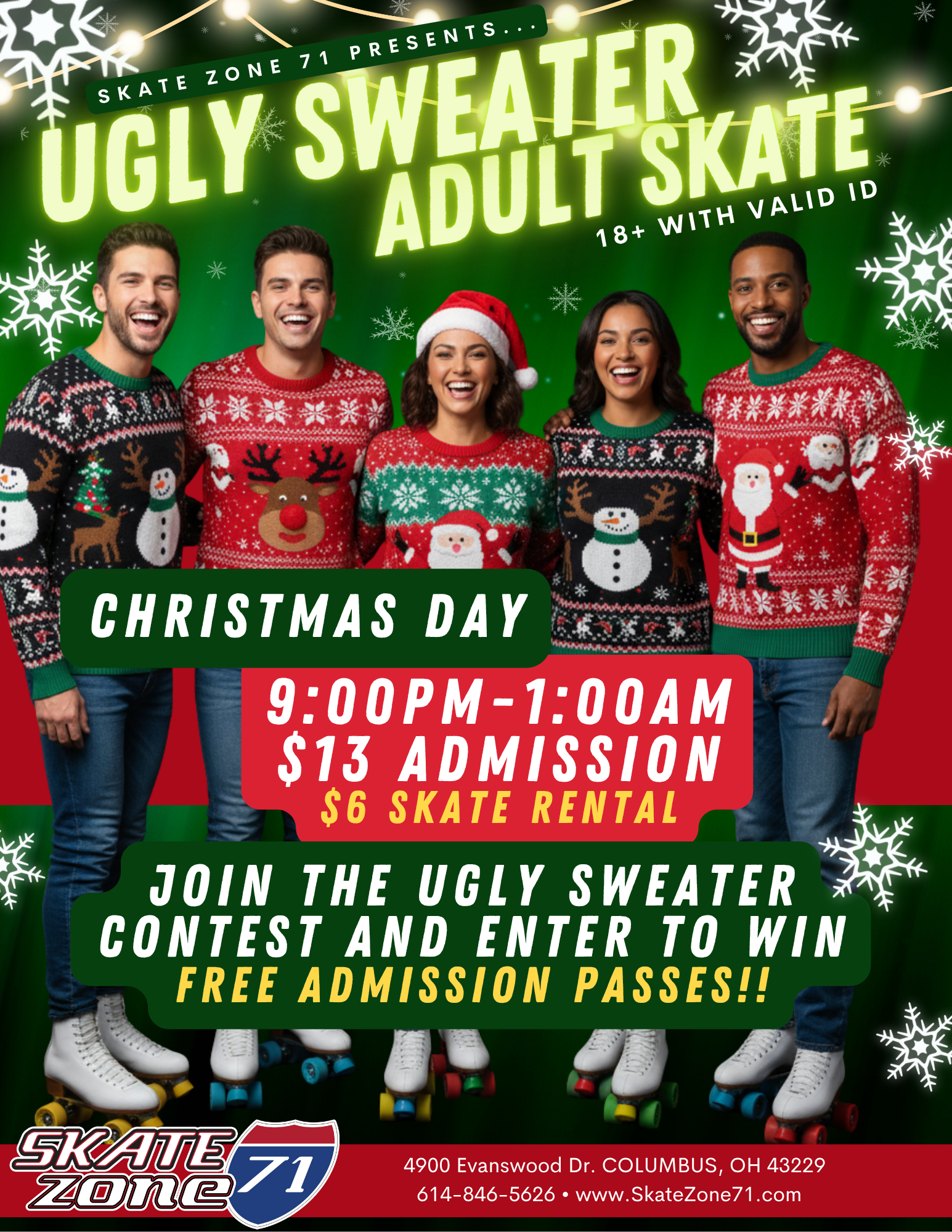 Ugly Sweater Adult Skate Thursday December 25th | 9:00 PM – 1:00 AM Join our Ugly Sweater Contest for your chance to win FREE Future Admission Passes! Admission: $13.00 Skate Rental: $6.00 Non-Skating Admission: $19.00 Adult Skates 18+ ONLY with Valid Photo ID 👉 PURCHASE TICKETS HERE! ⏰ Session Times: Begin and end at the posted start & […]