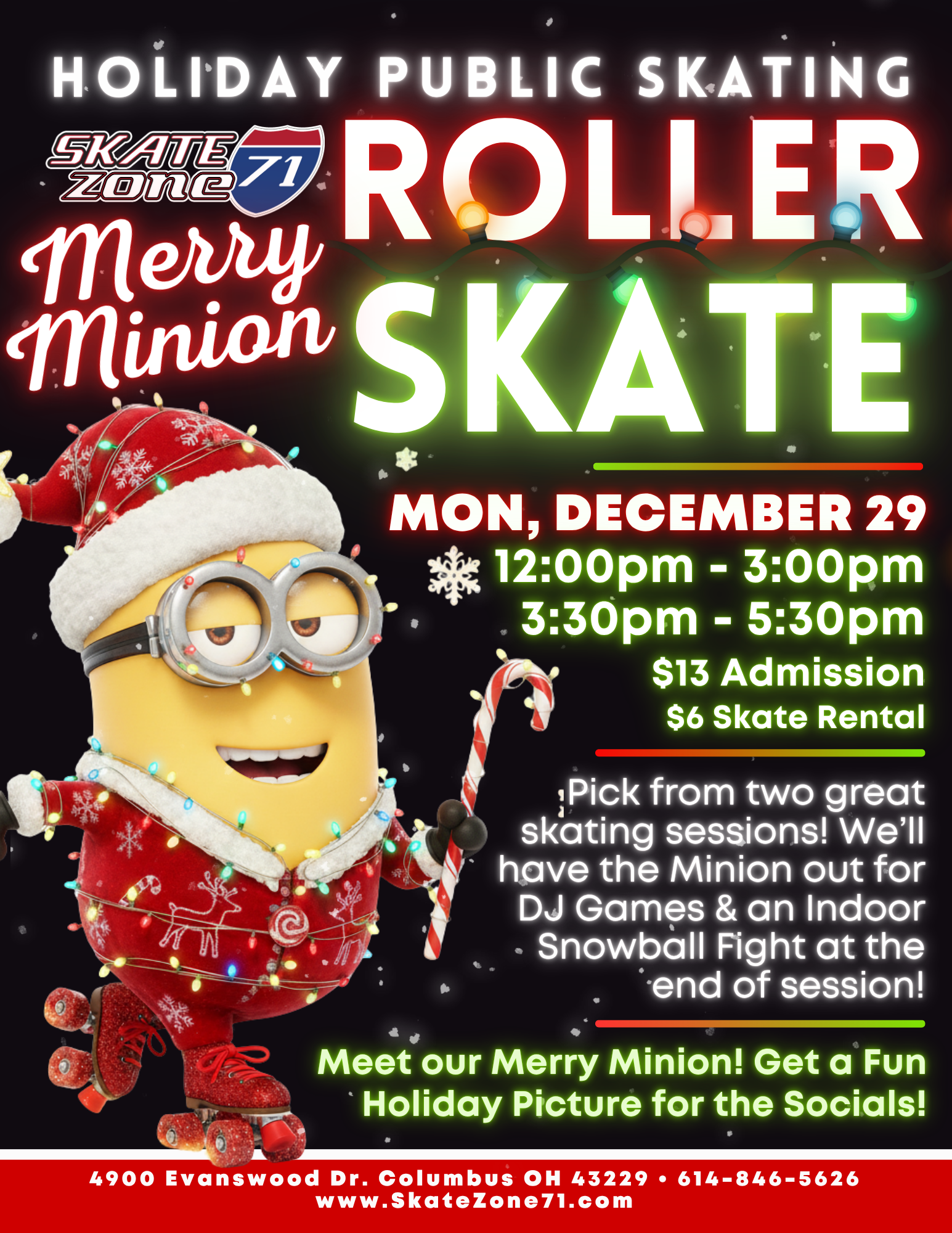Merry Minion Skate Monday December 29th 12:00 PM - 3:00 PM | 3:30 PM - 5:30 PM Pick from two great skating sessions! We'll have the Minion out for DJ Games & an Indoor Snowball Fight at the end of session!! Meet our Merry Minion and get a fun Holiday Picture for the socials!! Admission: $13.00Skate […]