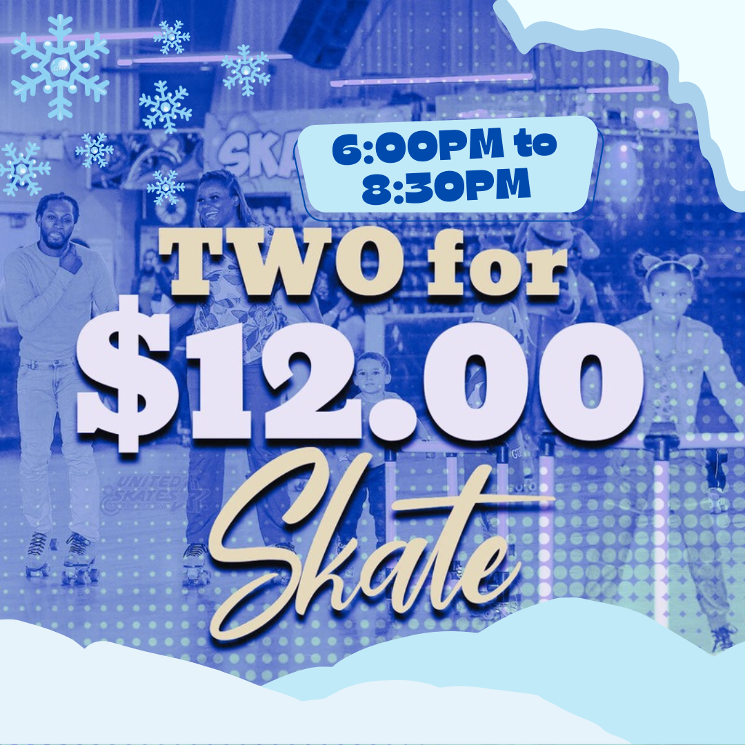Winter Break 2 for $12 Tuesday 6:00PM – 8:30PM Admission: 2 for $12 Admissions/1 for $7 Admission Skate Rental: $6.00 PURCHASE TICKETS HERE! BIRTHDAY PARTIES AVAILABLE! FAMILY TOP 40/POP Session Times: Begin and end at the posted start & end time—no stayovers allowed. 🚨 Important Info: All guests ages 3-17 must pay admission & skate rental (or bring […]