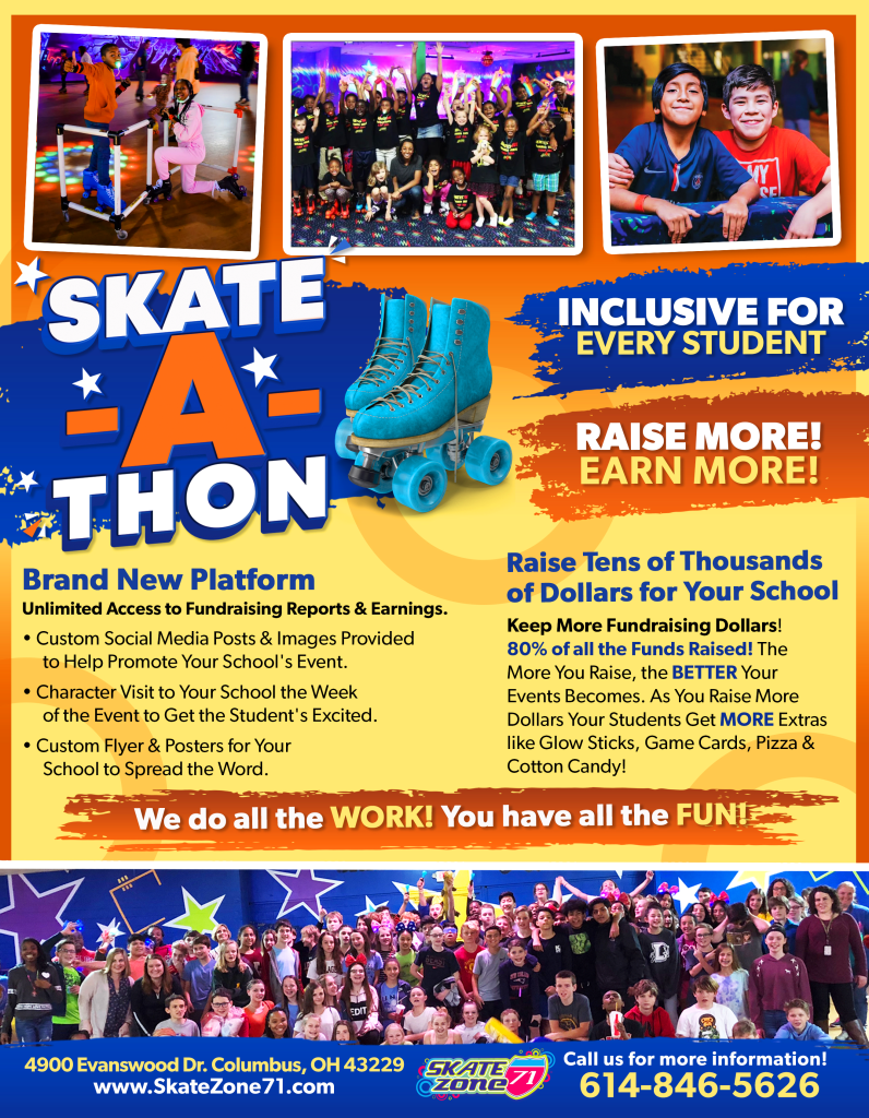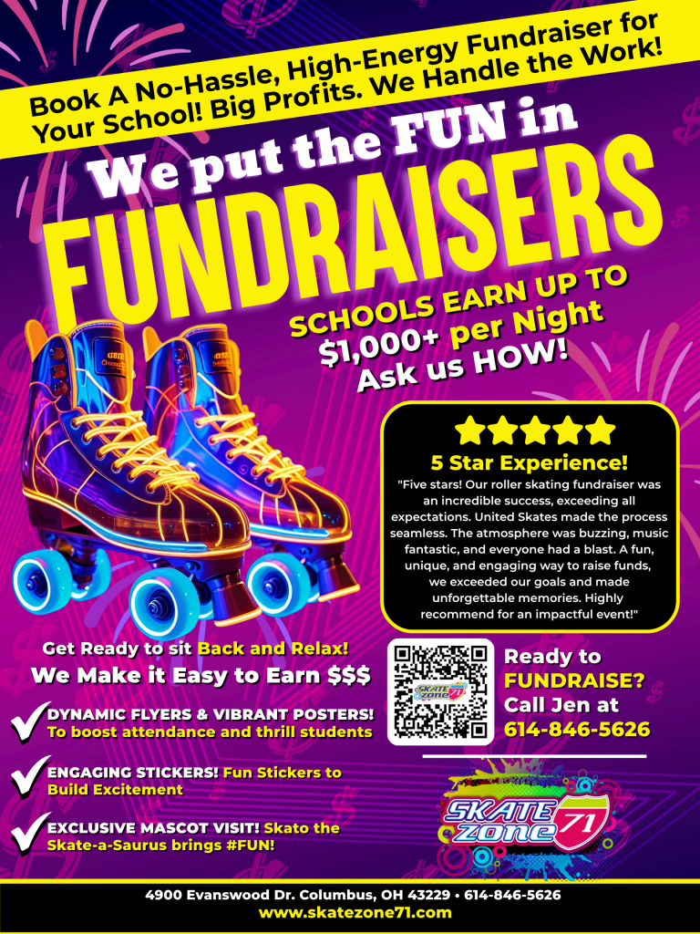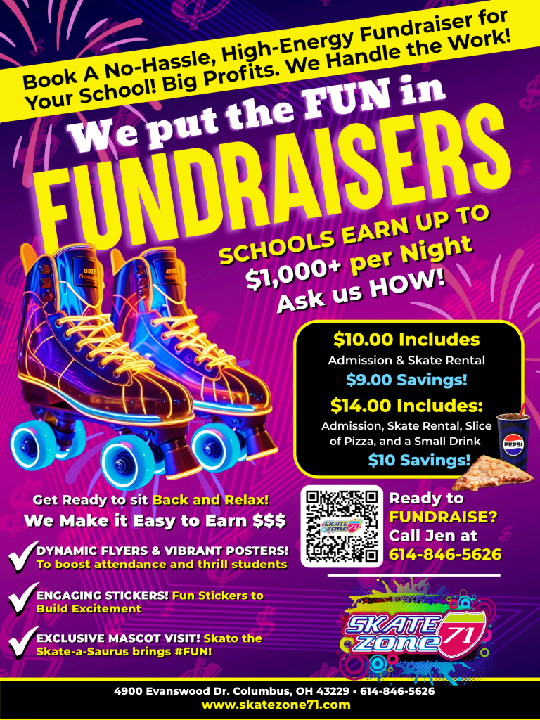 Raise funds for your school, group, or church while you skate! We’ll provide all the marketing pieces so all you have to do is spread the word and show up. Choose from one of our packages below and contact us to get your fundraiser set up. We do all the work and you have all the fun!