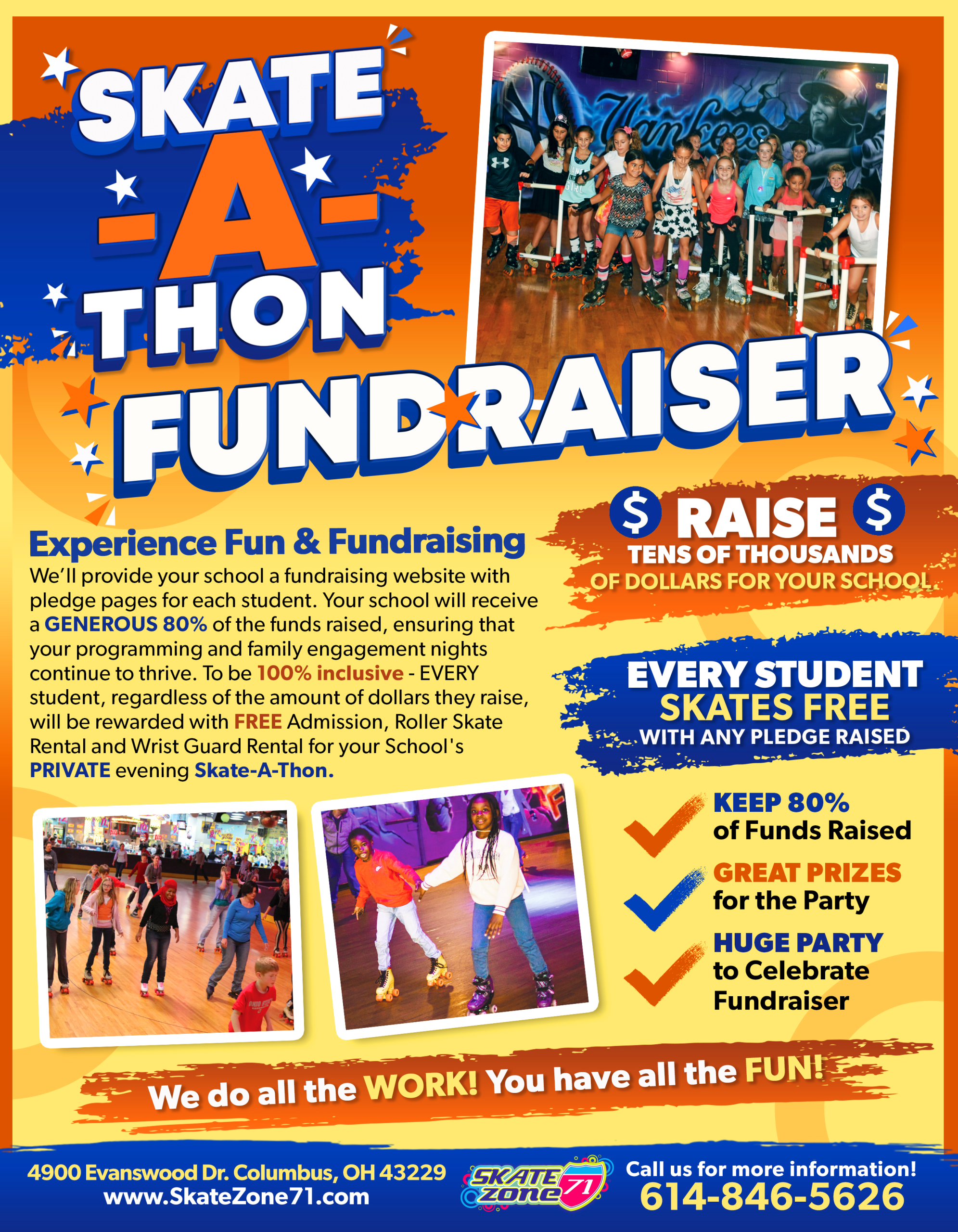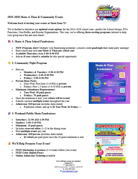 Raise funds for your school, group, or church while you skate! We’ll provide all the marketing pieces so all you have to do is spread the word and show up. Choose from one of our packages below and contact us to get your fundraiser set up. We do all the work and you have all the fun!