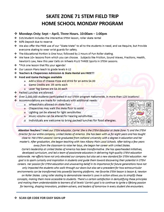 Introduce your students to a unique educational STEM field trip at Skate Zone 71 that gets them excited about learning! Students will learn how the concepts of science, technology, engineering, and math can be found in everyday experiences, even fun experiences like roller skating!