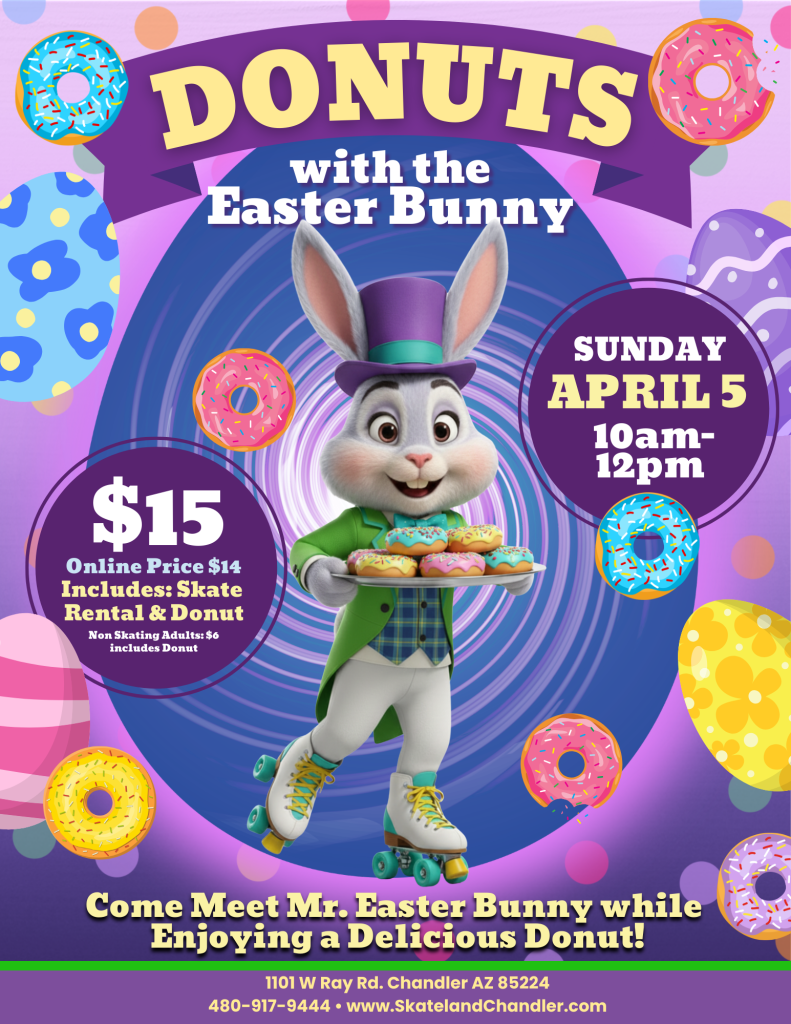 Join us for Donuts with the Easter Bunny on Sunday, April 5th from 10am-12pm! This is the perfect chance to meet Mr. Easter Bunny, grab some great photos, and enjoy a sweet treat while you skate.