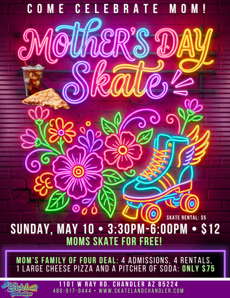 Celebrate Mom in style this year! Treat her to a day of music, memories, and neon lights at our Mother’s Day Skate! 🌸🛼