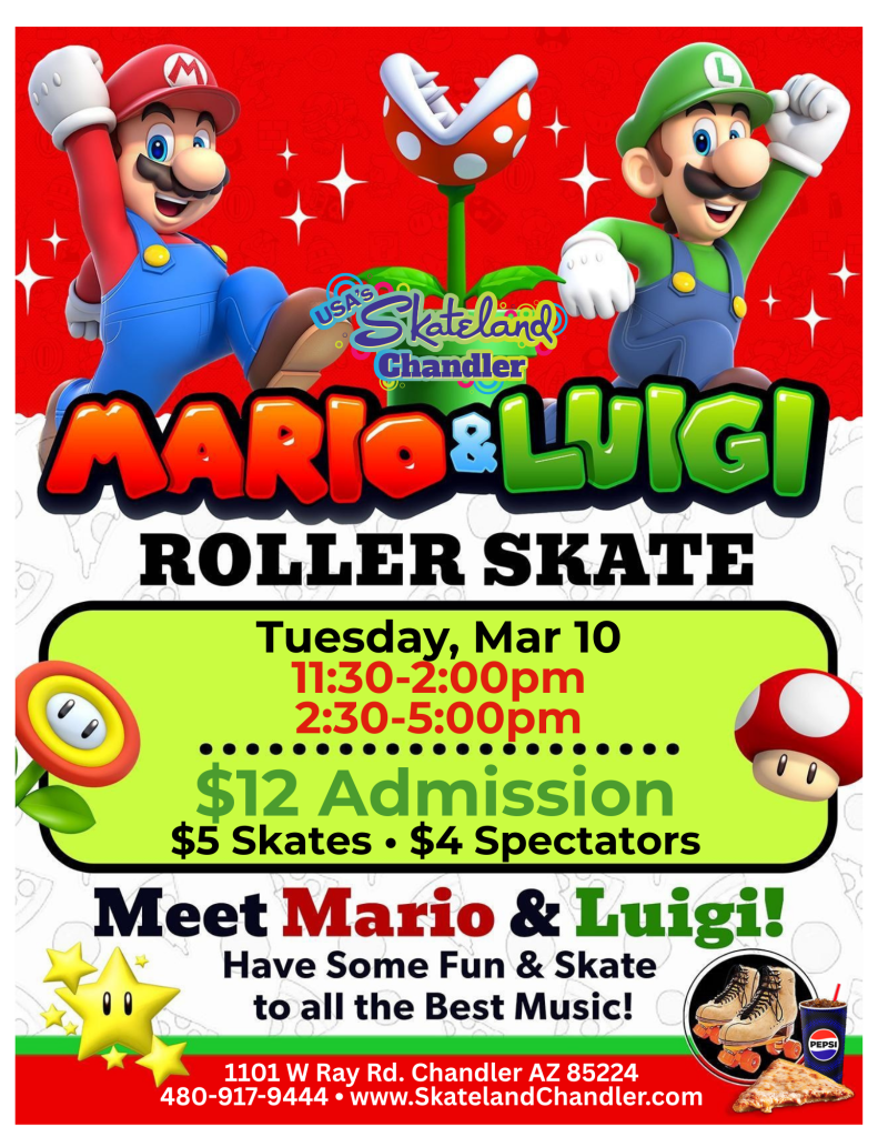 Power up your Tuesday! ποΈπ¨ Mario and Luigi are taking a break from the Mushroom Kingdom to hit the rink at Skateland Chandler! Come skate, play, and snap a pic with the world’s most famous brothers! πΈπ