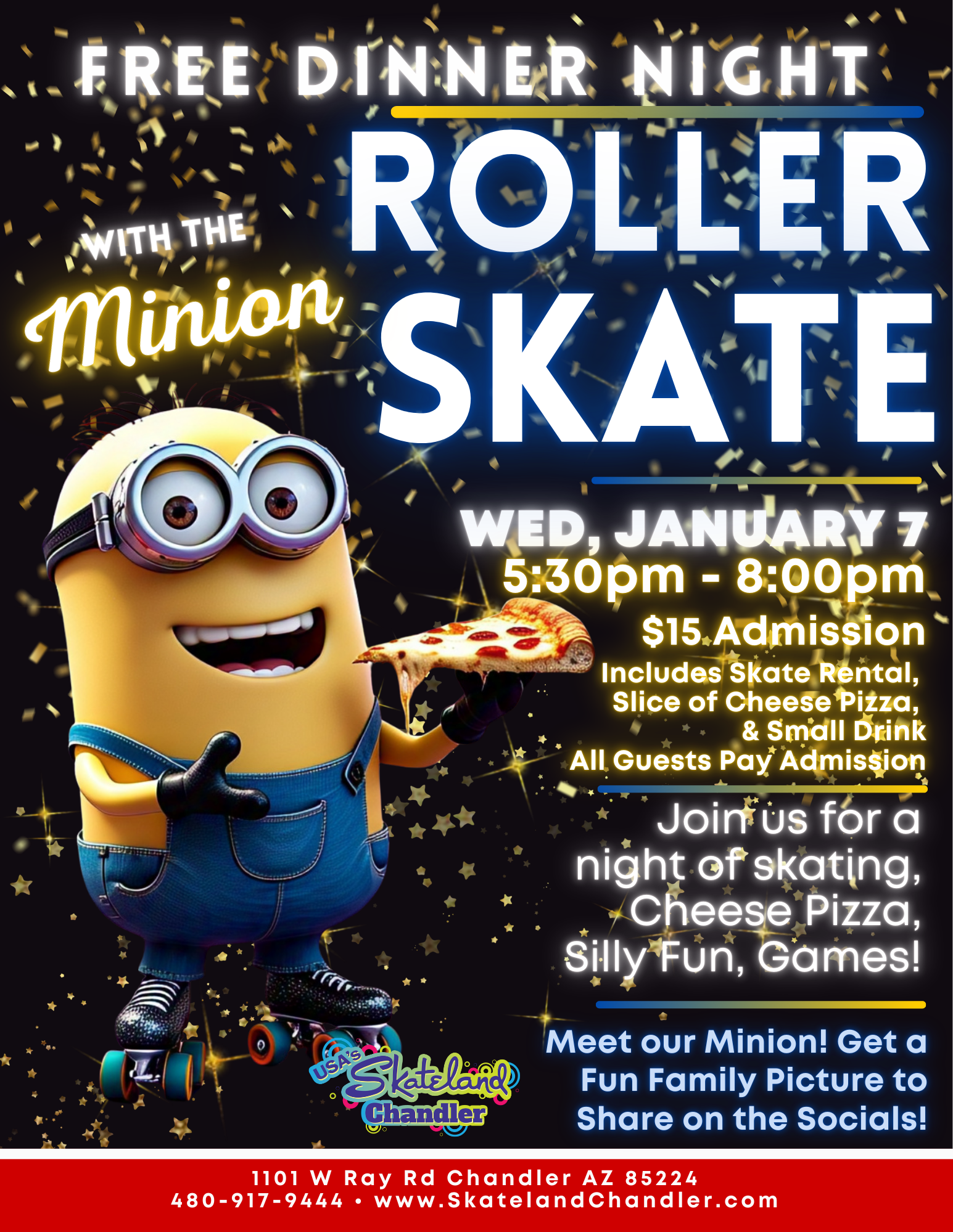 Roll in for a fun-filled night that includes skating, food, and a special meet & greet with the Minion! Perfect for families, friends, and anyone who loves a little extra chaos on wheels.