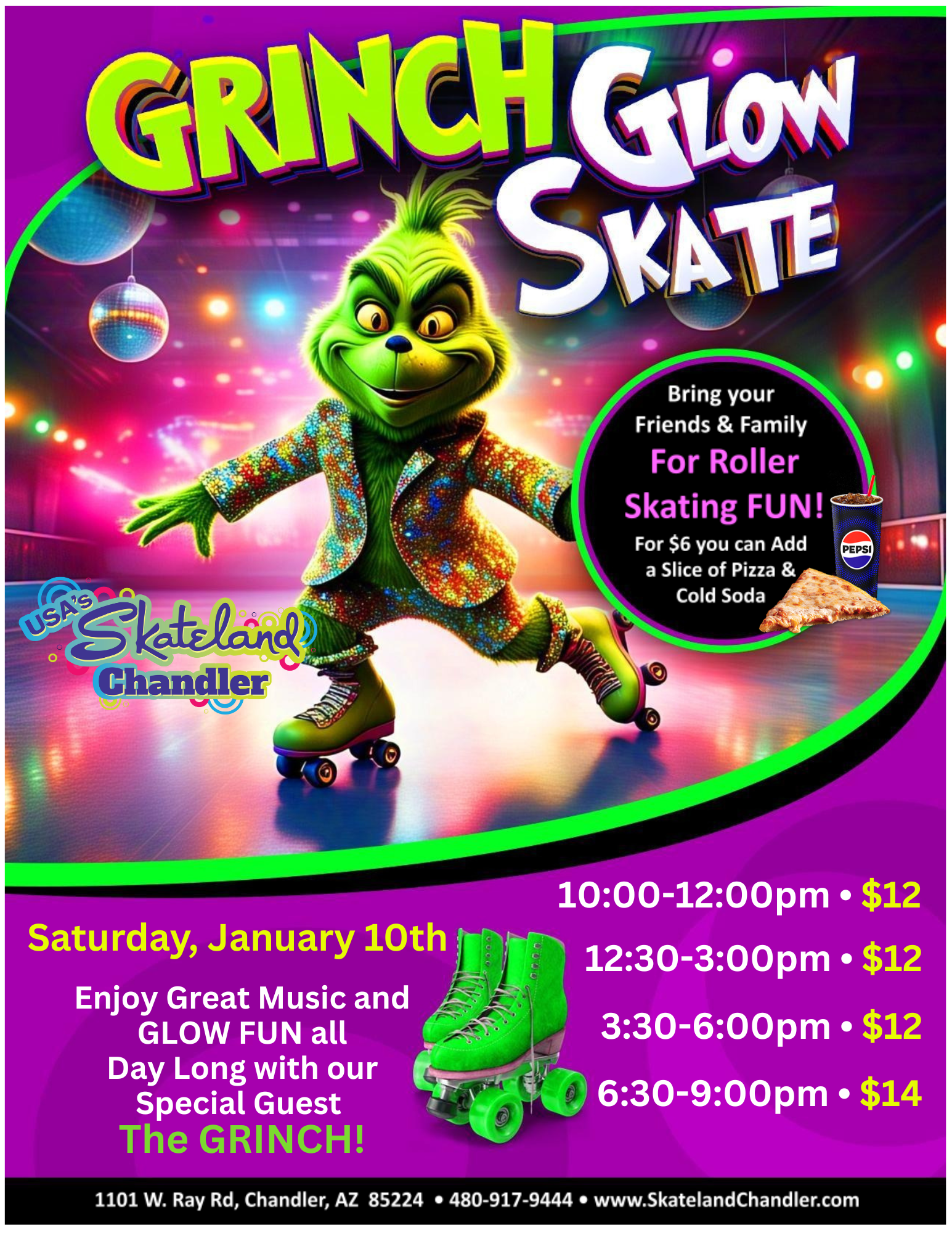 Have a glowing good time at our Grinch Glow Skate! Lights down, glow up, and roll into some mischievous fun perfect for all ages.
