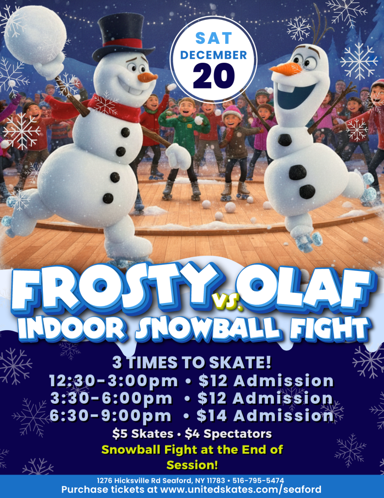 Get ready for the coolest winter showdown of the season! Join us for a magical afternoon of skating, winter fun, and the ultimate Indoor Snowball Fight: Team Frosty vs. Team Olaf! The snowball battle erupts at the end of the session—choose your team, grab your soft snowballs, and let the frosty fun fly!