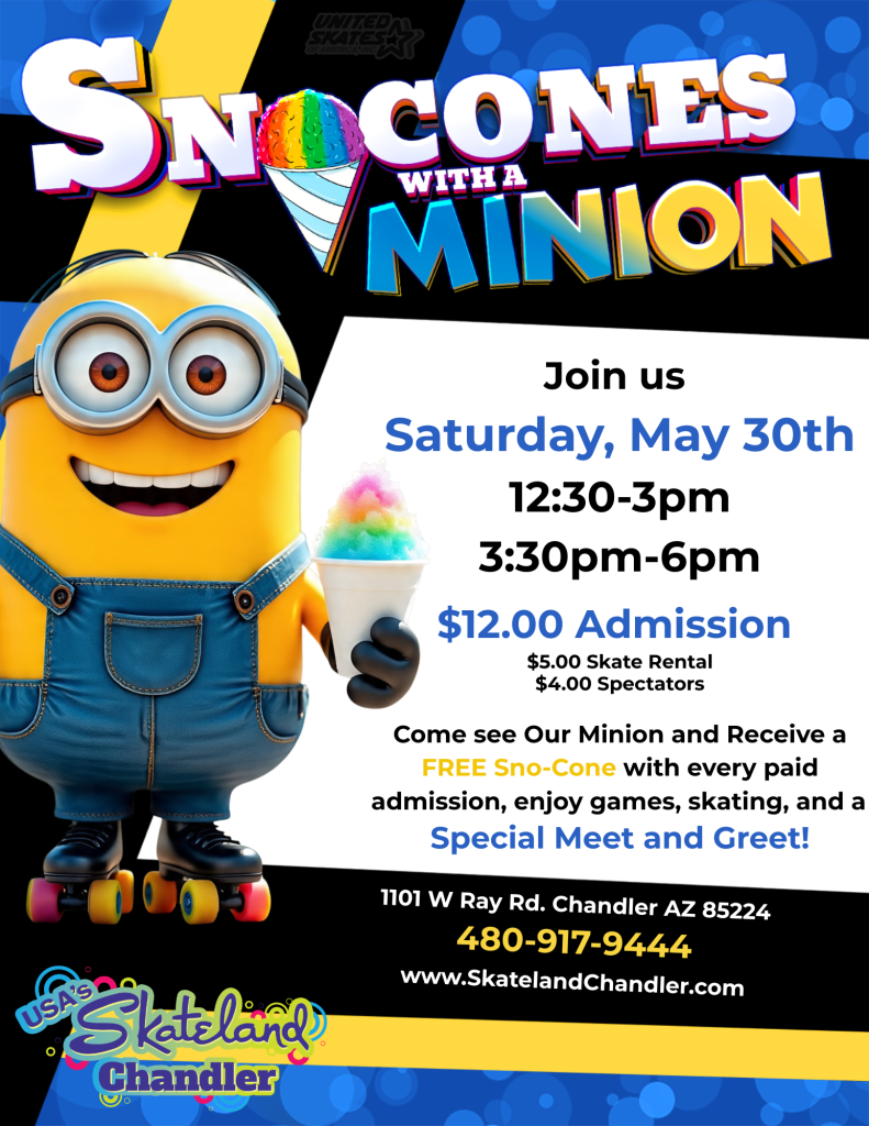 Get ready for a one-of-a-kind afternoon of skating, snacks, and smiles! Our favorite yellow friend is rolling into Skateland Chandler for a very special meet and greet, and you’re invited to join the fun.