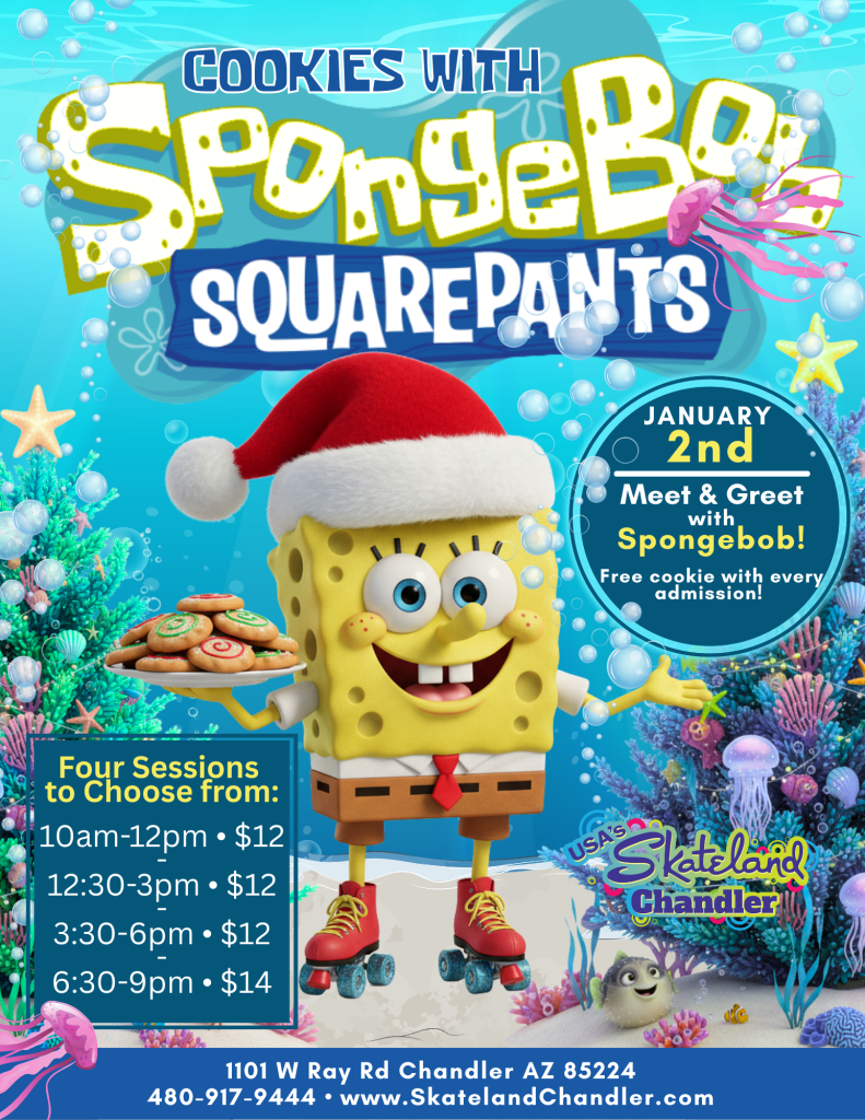 Start the new year with a sweet and silly celebration at Cookies With SpongeBob Skate! Join SpongeBob and Patrick for a fun-filled morning of skating, smiles, and festive vibes. Enjoy Disney and Holiday hits all session long, creating the perfect upbeat atmosphere for families and fans of all ages.