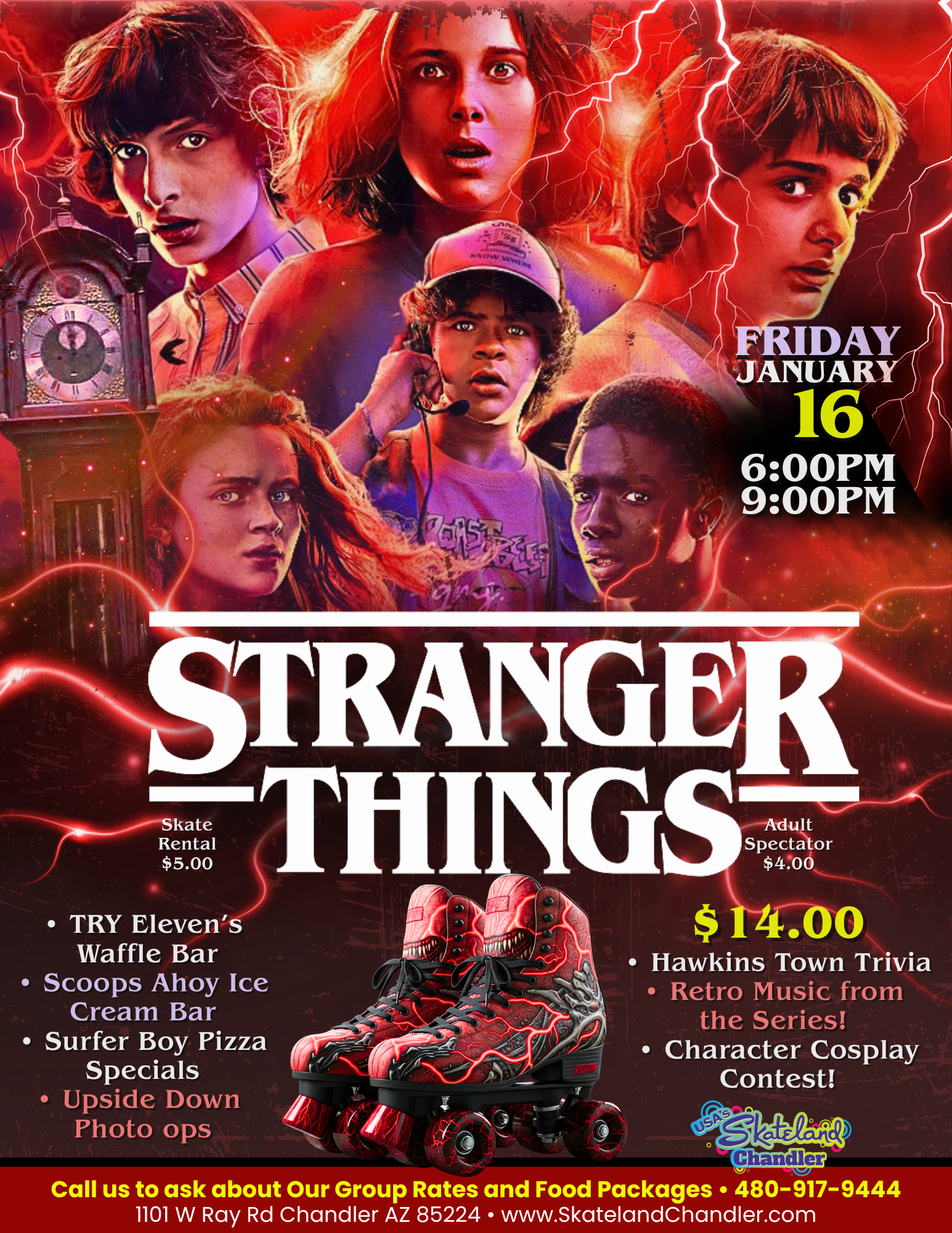 Skate through a night inspired by Stranger Things with eerie vibes, throwback energy, and an atmosphere straight out of Hawkins. Expect great music, themed fun, and a little mystery on the rink.