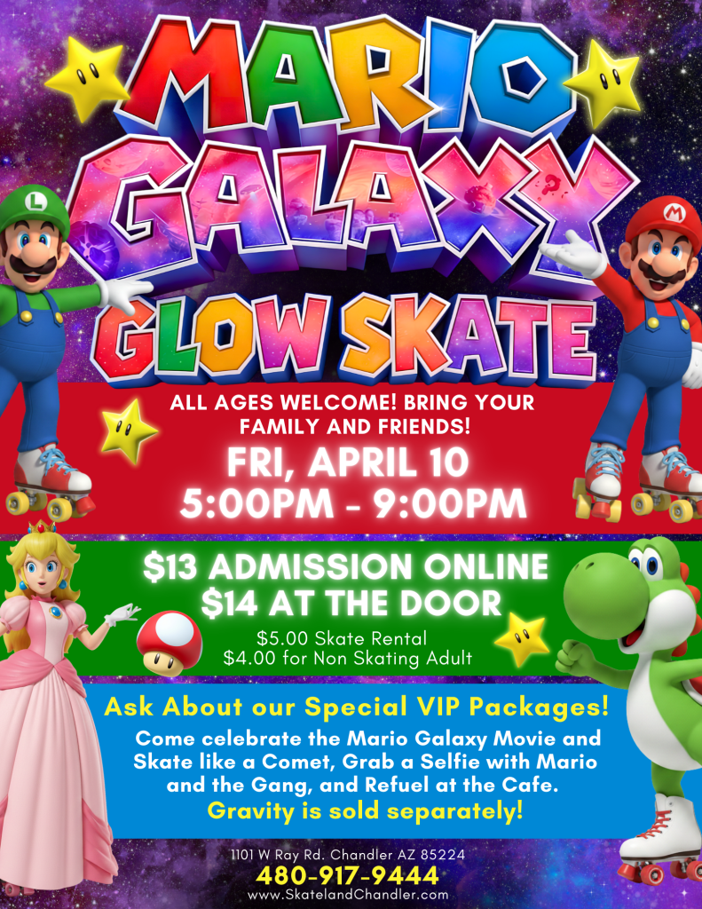 Don’t get left at the starting line! We are warping to a whole new galaxy for the Mario Galaxy Glow Skate! 🌌🛼 If you’re not here, you’re missing the biggest party in the Mushroom Kingdom.
