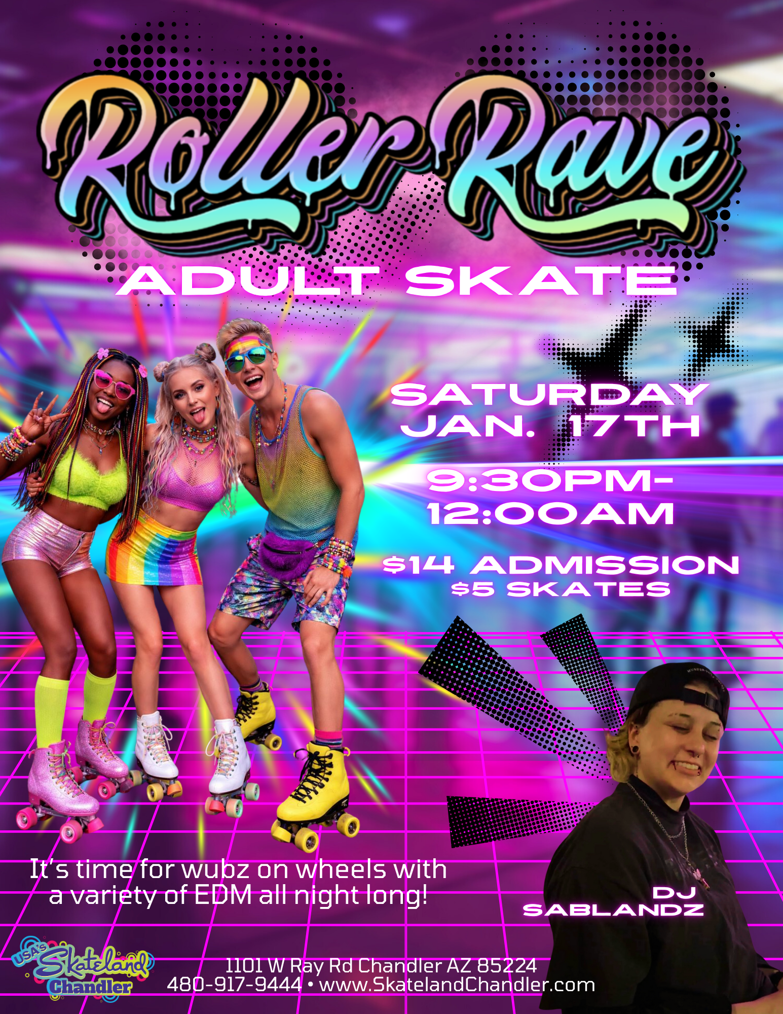 Step into a neon-soaked roller rink where festival energy meets throwback vibes. Bass-heavy EDM, lasers, glow, and nonstop movement—this is wubz on wheels.