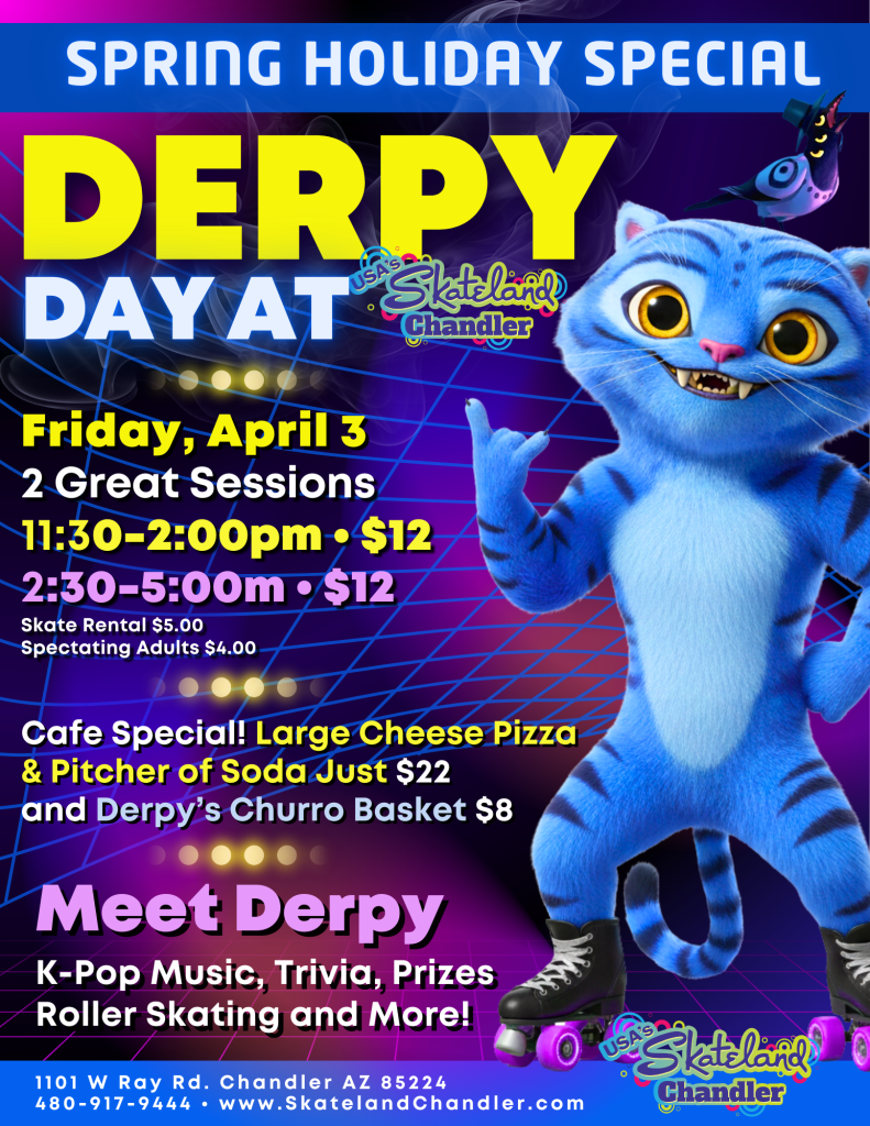 Get ready to roll, Chandler! 🛼 Whether you’re a K-Pop stan or just looking for the ultimate Spring Holiday vibe, you do not want to miss Derpy Day at Skateland! 🐈⬛✨