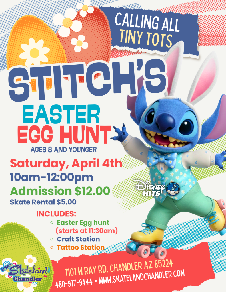 Don’t let your little ones miss out on Stitch’s Tiny Tot Easter Egg Hunt! We’re talking skating, crafts, and an epic egg hunt with everyone’s favorite space invader. Spots are filling up fast, and you don’t want to be the one watching the photos on your feed instead of being in them! 📸✨