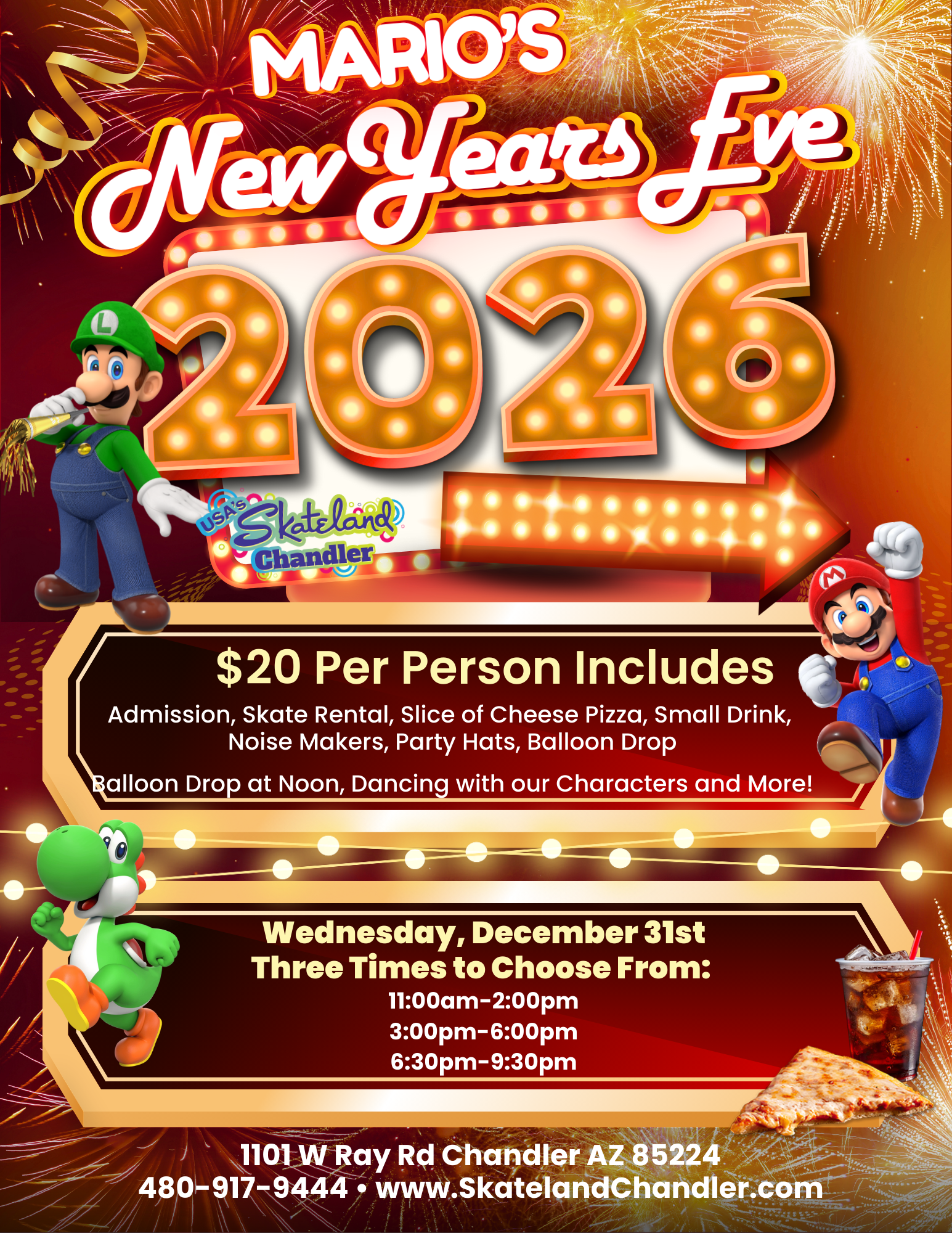 ❤️🍕 Mario’s New Year’s Eve Pizza Party at Skateland Chandler! 🍕❤️