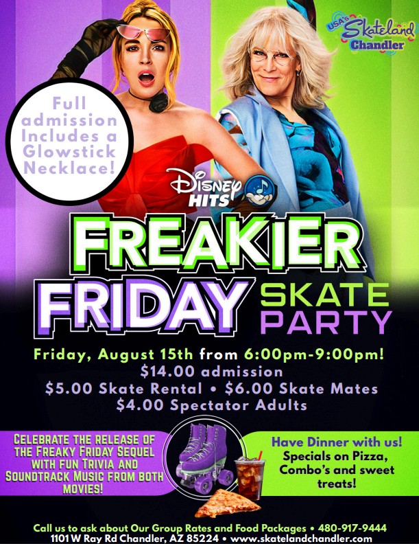 🎬🛼 Freakier Friday Skate Party! 🛼🎬Friday, August 15 • 6:00PM–9:00PM Get ready to flip out—again! Join us at Skateland Chandler for a magical night of music, mayhem, and wheels as […]