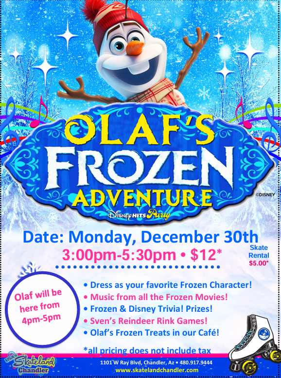 ❄️ Olaf's Frozen Adventure! ⛄ Join us on Monday, December 30th from 3:00 PM - 5:30 PM for a frosty fun-filled afternoon at Skateland Chandler! 💲 Admission: $12* 🛼 Skate Rental: $5.00* (*All pricing does not include tax) ✨ Event Highlights: Dress as your favorite Frozen character! Enjoy music from all the Frozen movies! Participate […]
