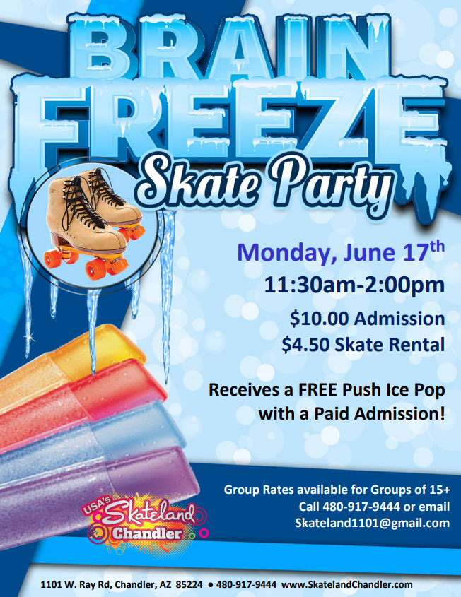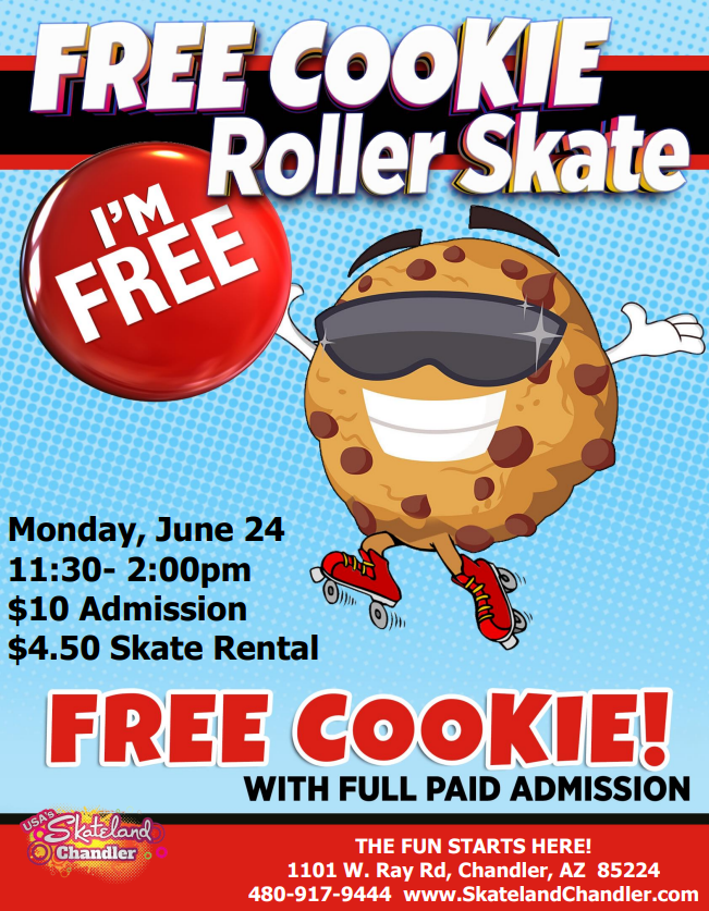 Skateland Chandler 1101 W. Ray Rd., Chandler, AZ, United StatesAdmission $15.00 includes skate rental, slice of cheese pizza and a small drink *no passes