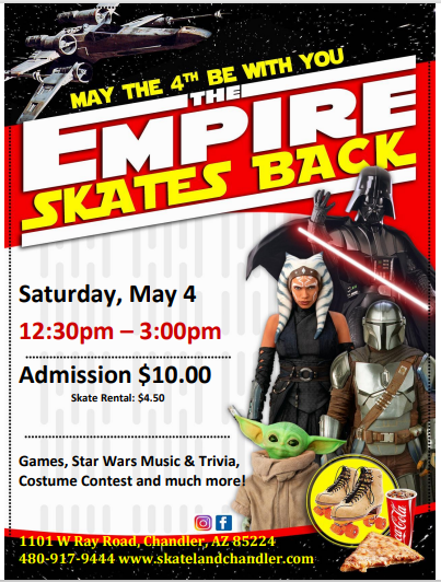 Saturday, May 4 12:30pm - 3:00pm $10 Admission $4.50 Skate Rental ✨ Come celebrate May 4 with us here at Skateland Chandler!!✨ Disney Hits - Star Wars Soundtrack - Top 40 Pop Dress up as your favorite characters BIRTHDAY PARTIES AVAILABLE! ALL CHILDREN AGES 2-17 MUST PAY ADMISSION & ROLLER SKATE RENTAL (OR BRING THEIR […]