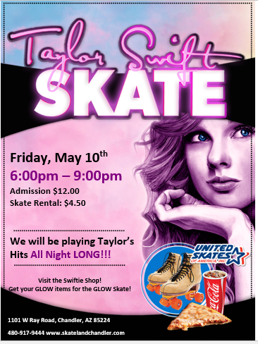 It's our Roller Skating Era! Come Skate to the best of Taylor Swift all session long. Friday, May 10 6:00pm - 9:00pm Admission: $12.00 Skate Rental: $4.50 Dress in you best Era or as you best Taylor Swift. Selfie Station