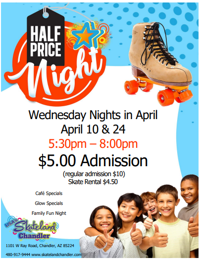 We have 2 Wednesdays that are half price nights this April April 10 and 24 5:30pm - 8:00pm Admission: $5.00 Skate Rental: $4.50