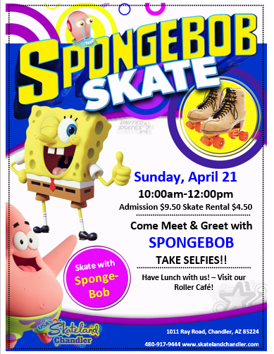 Join for a meet and greet with Sponge Bob! Sunday, April 21 10:00am -12:00pm Admission: $9.50 Skate Rental: $4.50