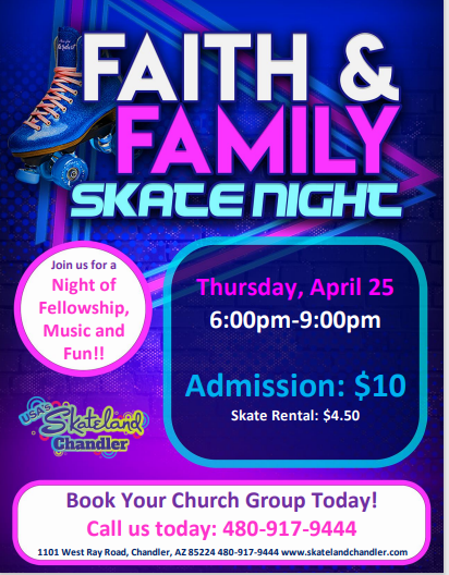 Thursday, April 25 6:00pm - 9:00pm Admission: $10.00 Skate Rental: $4.50 Join us for an amazing night of worship, praise and roller skating. Church youth groups we have group rates available call us 480-917-9444