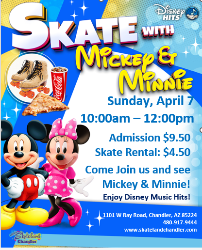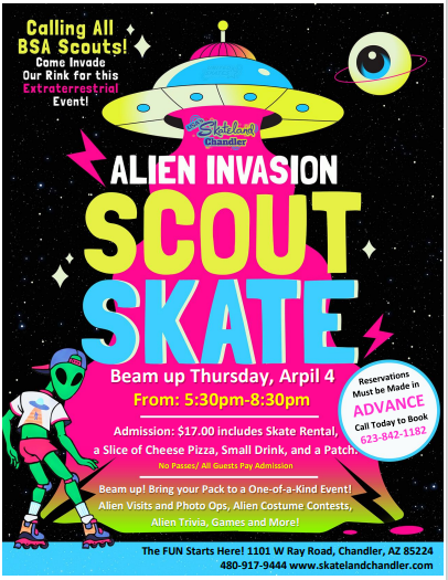 Come skate with us for an extraterrestrial session. Thursday, April 4 5:30pm-8:30pm Admission: $17.00 per person: Admission, Skate Rental, One Slice of Cheese Pizza, Small Drink and a Green Glow Necklace *No Passes* This event is open to the public. You can make a group reservation at 480-917-9444
