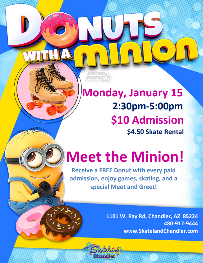 Enjoy an afternoon of skating, games, and a meet & greet with the Minion! $10 Admission includes a complimentary donut! $4.50 Skate Rental