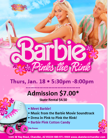 Thursday, Jan. 18, 2024 5:30pm - 8:00pm Admission: $7.00 Skate Rental: $4.50 Meet and Greet with Barbie Music from the Soundtrack Wear pink to pink the rink!