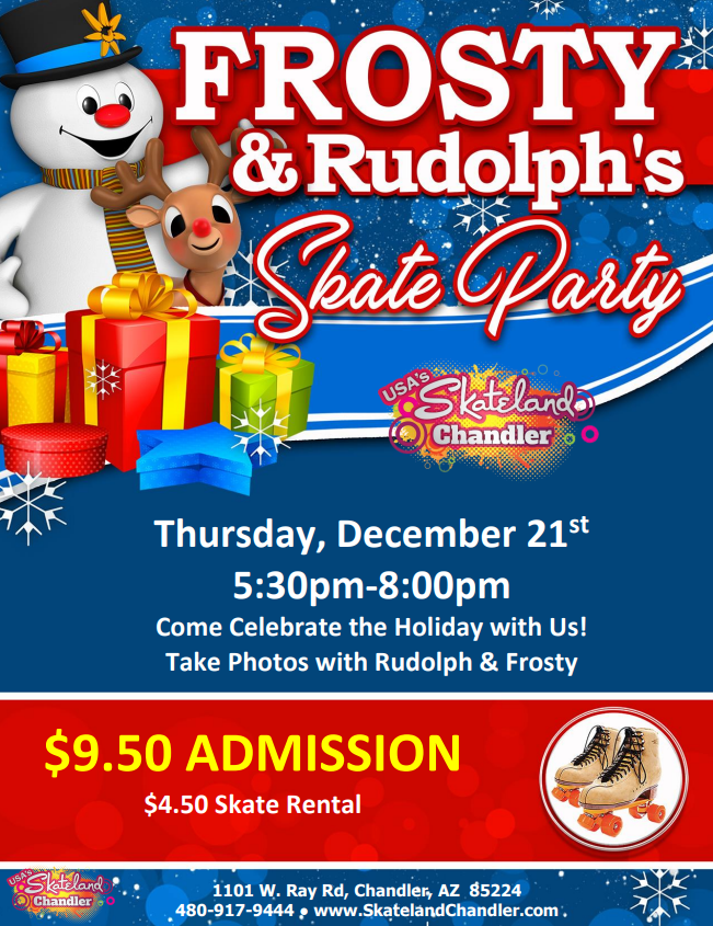 5:30PM – 8:00PM $9.50 Admission $4.50 Skate Rental Come celebrate the holiday with us here at Skateland Chandler!! Enjoy a FUN skating session with visits from our favorite holiday friends, 🦌 Rudolph & Frosty ⛄️! BIRTHDAY PARTIES AVAILABLE! ALL CHILDREN AGES 2-17 MUST PAY ADMISSION & ROLLER SKATE RENTAL (OR BRING THEIR OWN SKATES) NON-SKATING […]