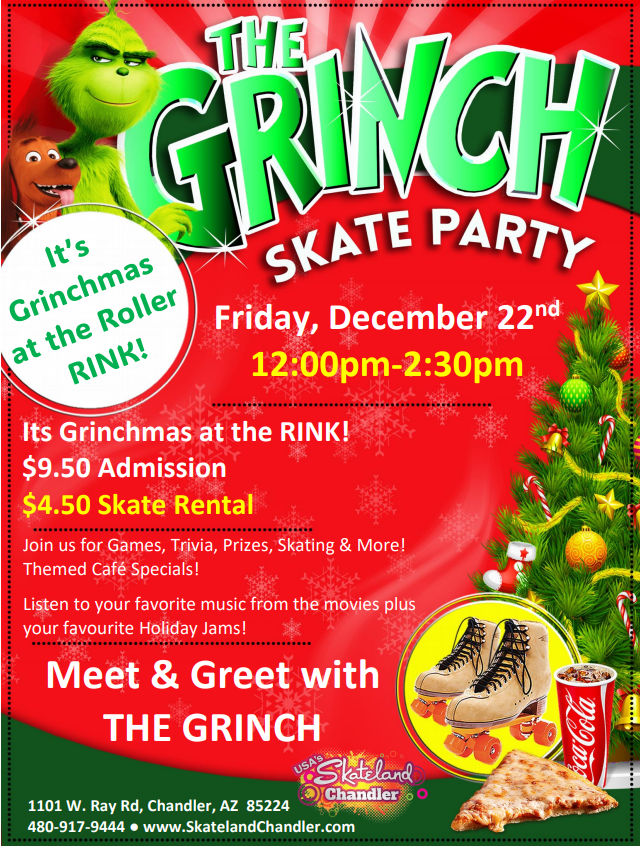 12:00PM – 2:30PM $9.50 Admission $4.50 Skate Rental Come celebrate the holiday with us here at Skateland Chandler!! ✨ Enjoy a FUN skating session with a visit from our favorite Whoville grouch, MR. GRINCH ✨ Holiday Music & Top 40 BIRTHDAY PARTIES AVAILABLE! ALL CHILDREN AGES 2-17 MUST PAY ADMISSION & ROLLER SKATE RENTAL (OR […]
