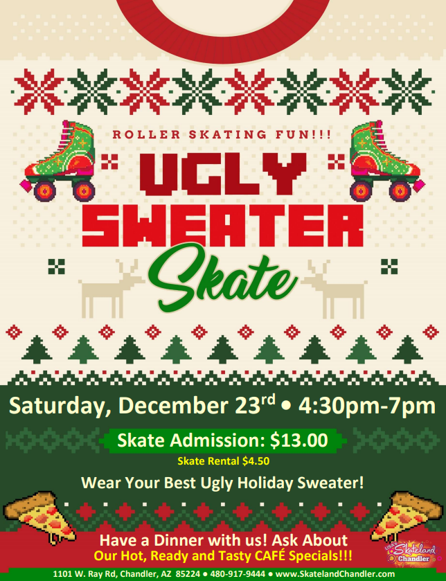 4:30PM – 7:00PM $13.00 Admission $4.50 Skate Rental Come celebrate the holiday with us here at Skateland Chandler!! ❄️ wear your ugliest holiday sweater ❄️ Holiday Music & Top 40 BIRTHDAY PARTIES AVAILABLE! ALL CHILDREN AGES 2-17 MUST PAY ADMISSION & ROLLER SKATE RENTAL (OR BRING THEIR OWN SKATES) NON-SKATING ADULTS MAY ENTER AT NO […]