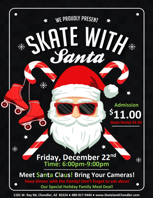 6:00PM – 9:00PM $11.00 Admission $4.50 Skate Rental Come celebrate the holiday with us here at Skateland Chandler!! 🎄 Enjoy a FUN skating session with a SPECIAL VISIT from Santa Claus 🎅 Holiday Music & Top 40 BIRTHDAY PARTIES AVAILABLE! ALL CHILDREN AGES 2-17 MUST PAY ADMISSION & ROLLER SKATE RENTAL (OR BRING THEIR OWN […]