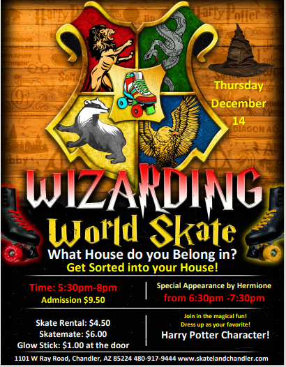 Join us for our Harry Potter Skate it is going to be Enchanting! Get ready to roll into the wizarding world with spells, skates and lots of fun! What house are you? Thursday, December 14 5:30pm - 8:00pm Admission: $9.50 Skate Rental: $4.50 Dress up in your house colors. Meet and greet with the character […]