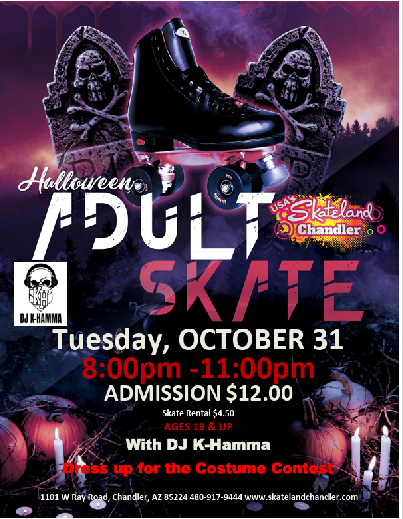 Happy Halloween Hip Hop & R&B Music - Featuring DJ K-Hamma 18+ with ID Admission: $12.00 Skate Rental: $4.50 No Passes Accepted All adults (18+) who will be skating need to fill out our waiver. Dress up for the costume contest