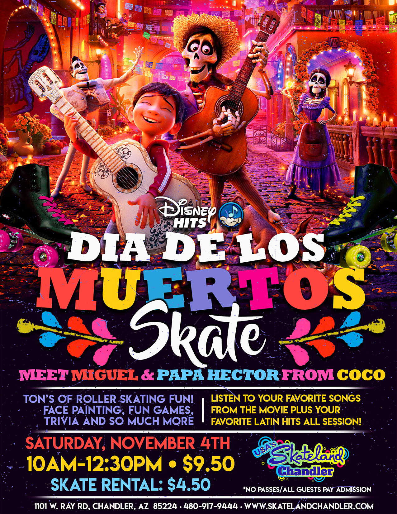Disney Hits Party with Miguel and Hector! Saturday, November 4 10:00am - 12:30pm Admission: $9.50 Skate Rental: $4.50 *No Passes* Come dressed up! Disney hits all session long.