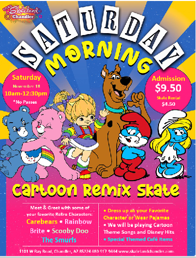 Join us for a fun filled session with some of your favorite cartoon Characters. Saturday, November 18, 2023 10:00am - 12:30pm Admission: $9.50* Skate Rental: $4.50 *No Passes* Meet and Greets with Scooby Doo, Papa Smurf, Smurfette, Rainbowbrite and the Carebears Music is Cartoon theme songs, Disney Hits and Kidzbop