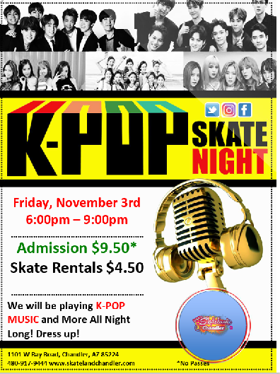 Do you like KPOP? We do, come skate with us! Friday, November 3 6:00pm - 9:00pm Admission: $12.00* Skate Rental: $4.50 We will be playing the best KPOP artists all session long. Dress up!